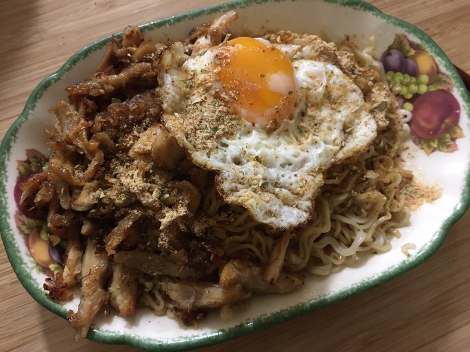 계란반숙과, 남은 치킨을 넣어서.